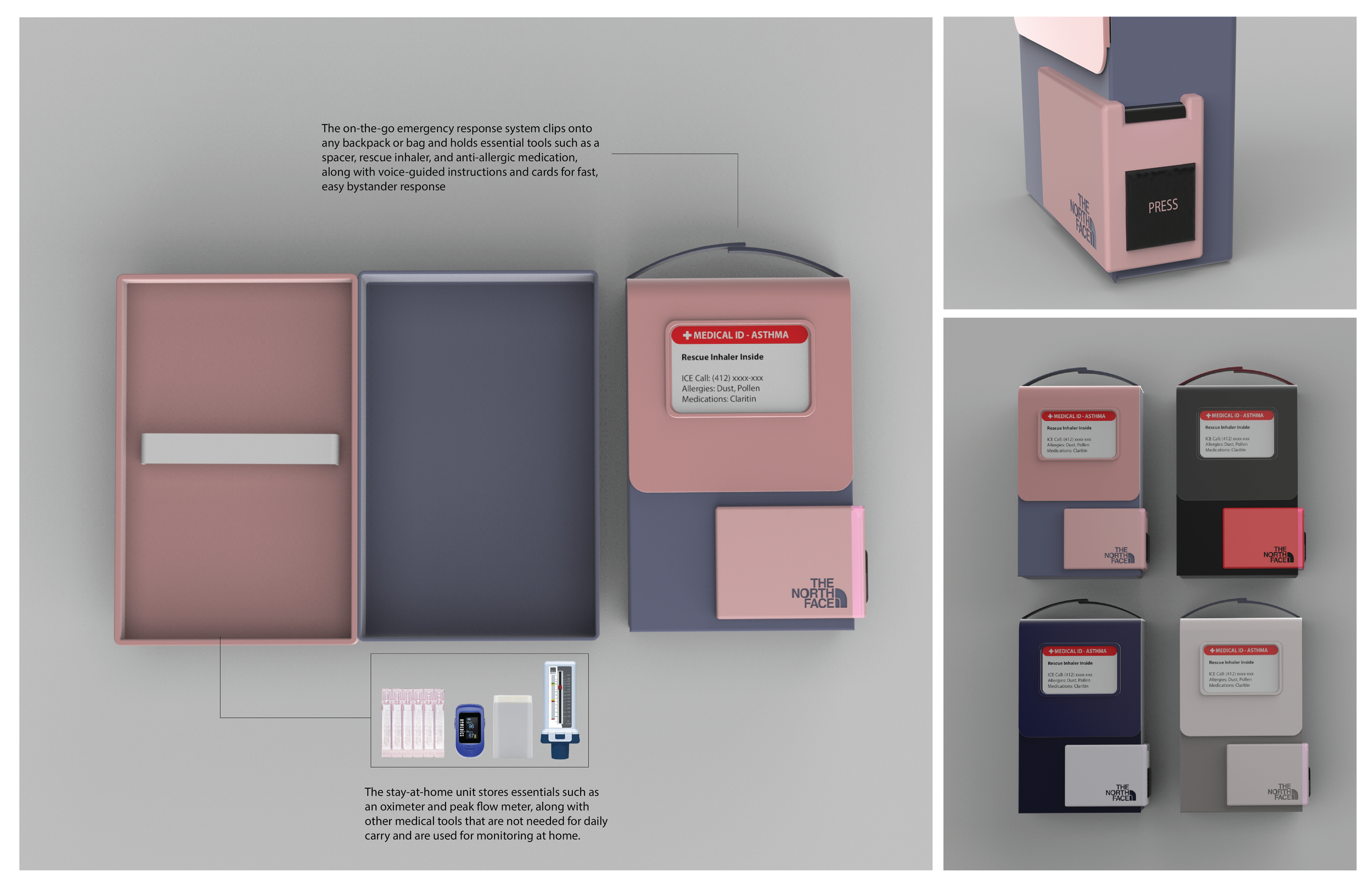Two-part system: A home base compartment for storing non-daily asthma essentials, and a portable emergency kit that stays attached to a student’s backpack.