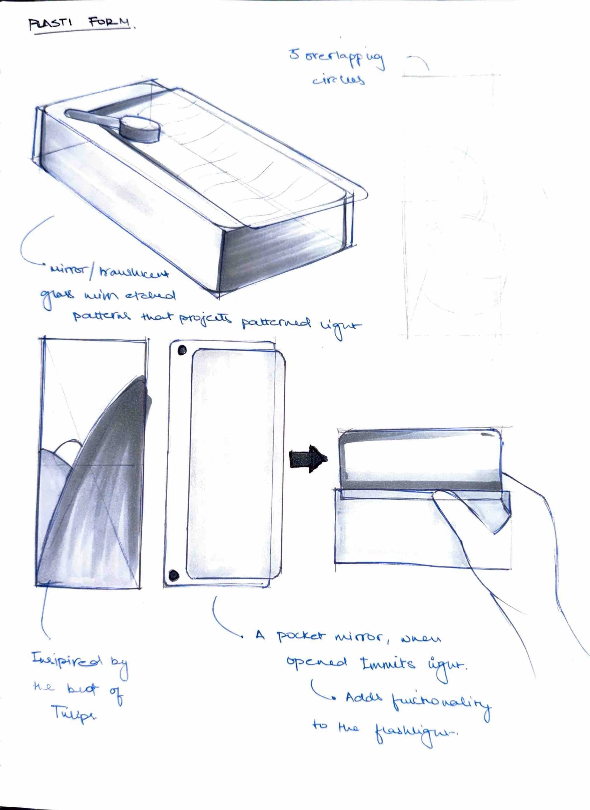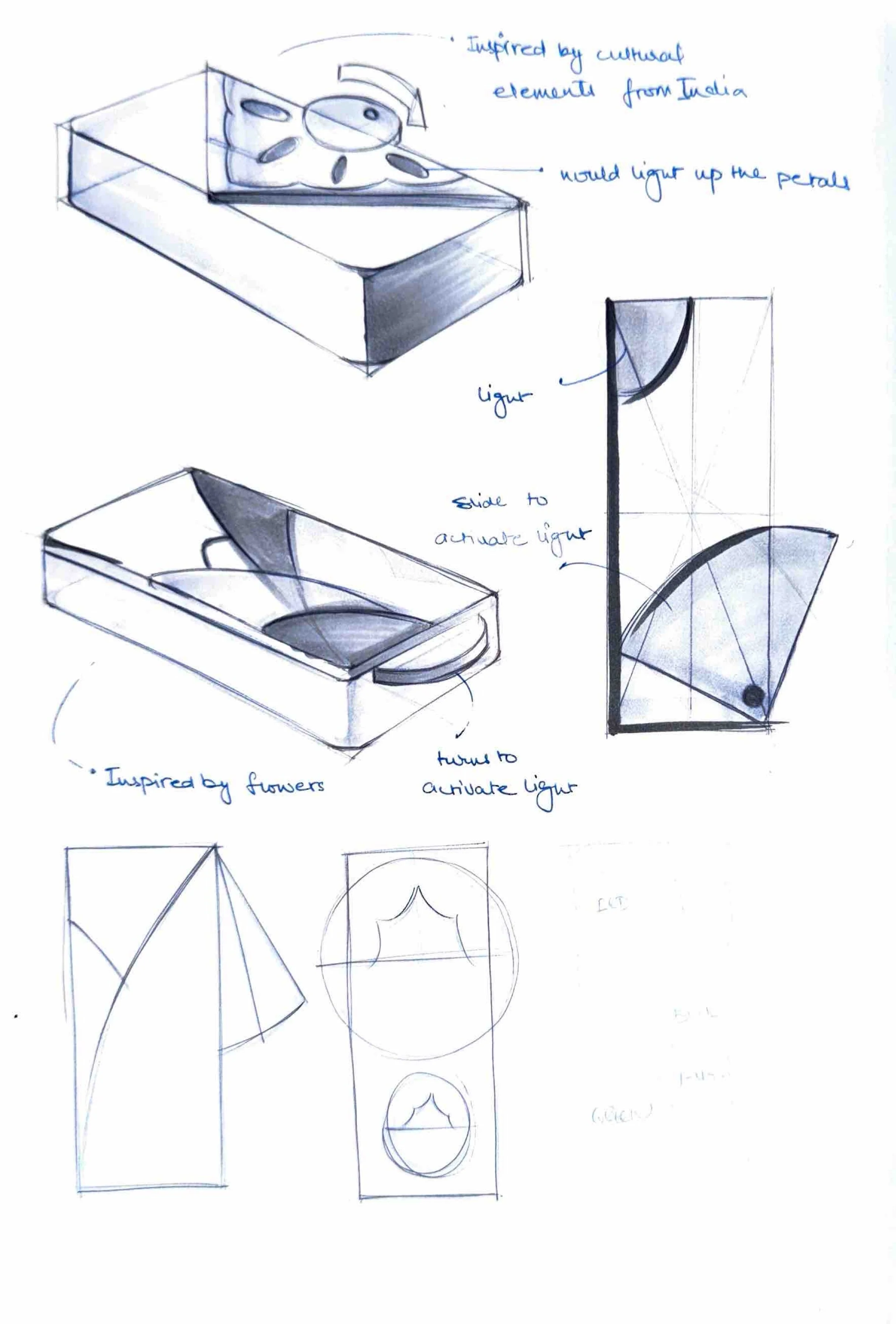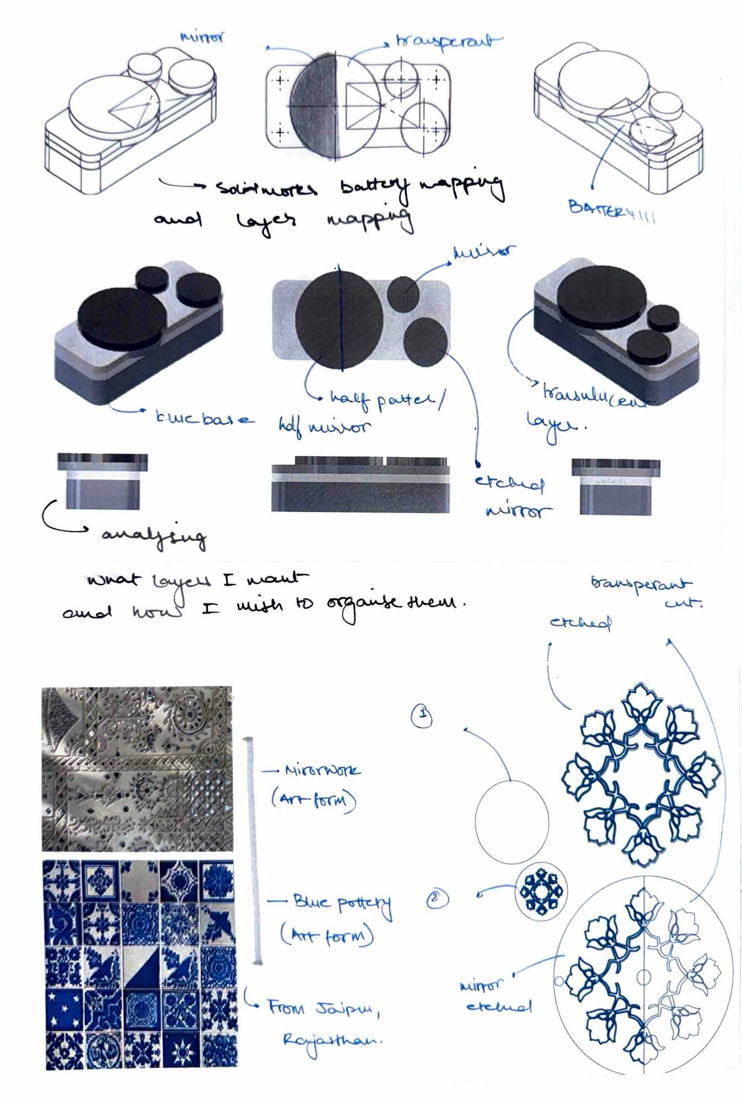 Neerja is a flashlight that blends traditional Indian craftsmanship with contemporary product design. Inspired by my hometown, Jaipur, the piece pays homage to two iconic art forms: Jaipur Blue Pottery, known for its delicate cobalt blue patterns on a white base, and Rajasthani mirror work, an intricate embroidery technique that reflects and refracts light.