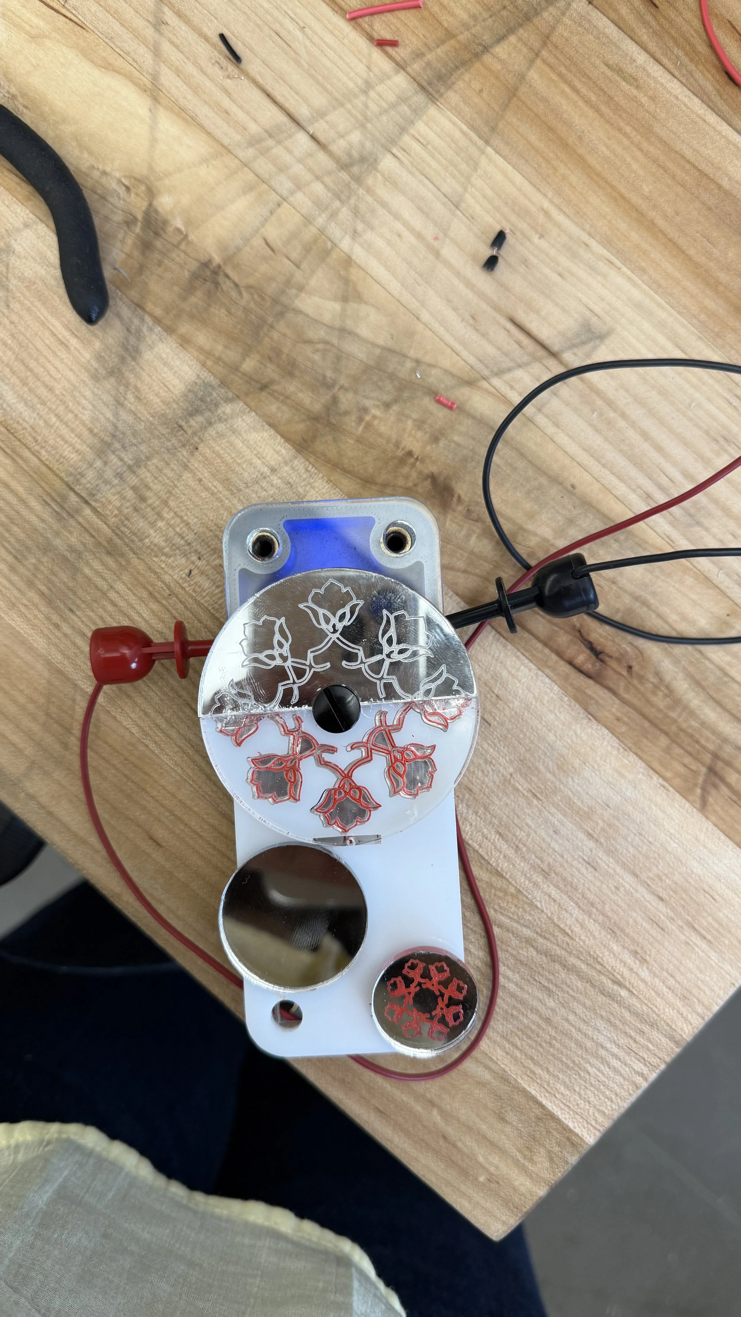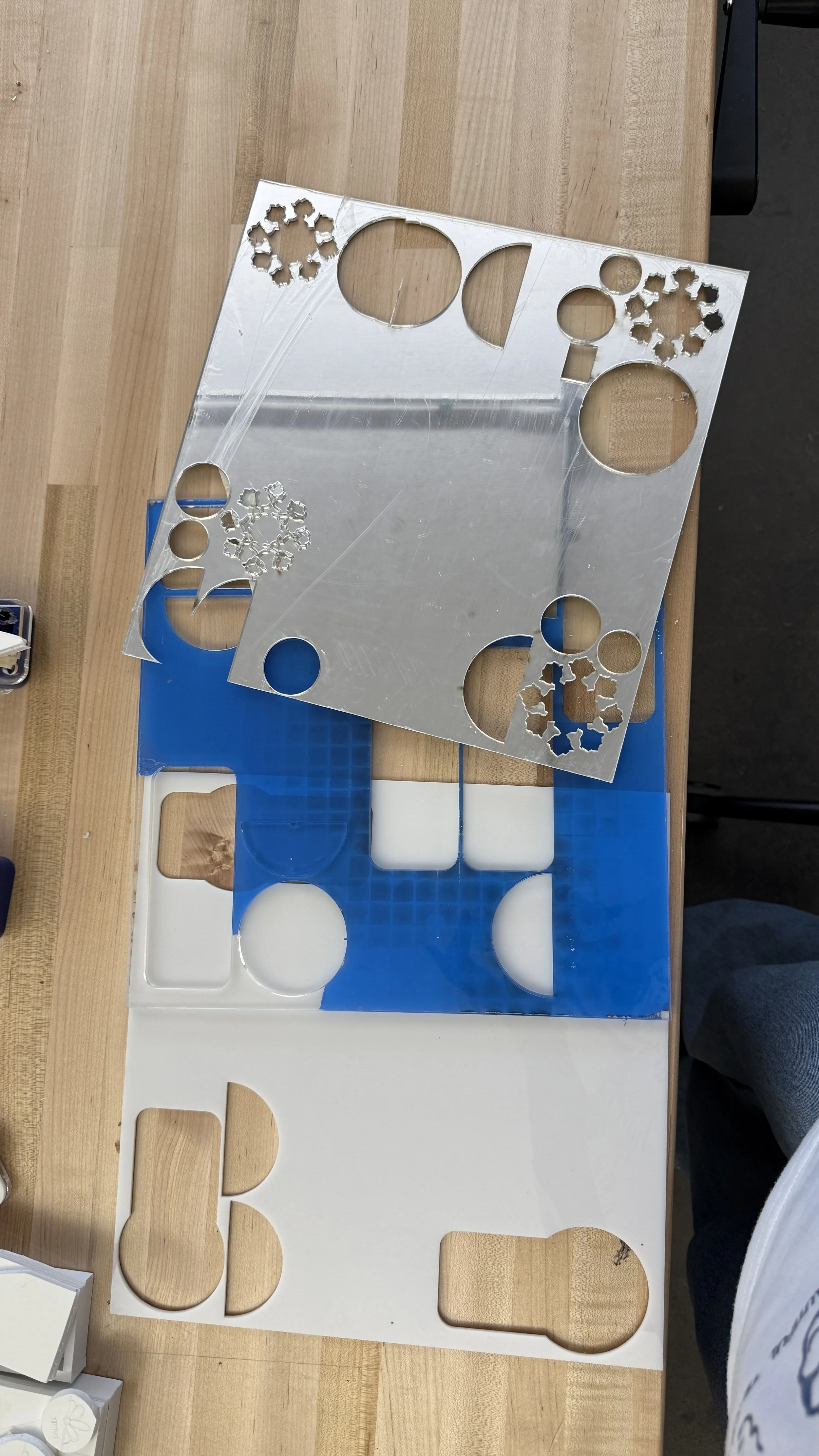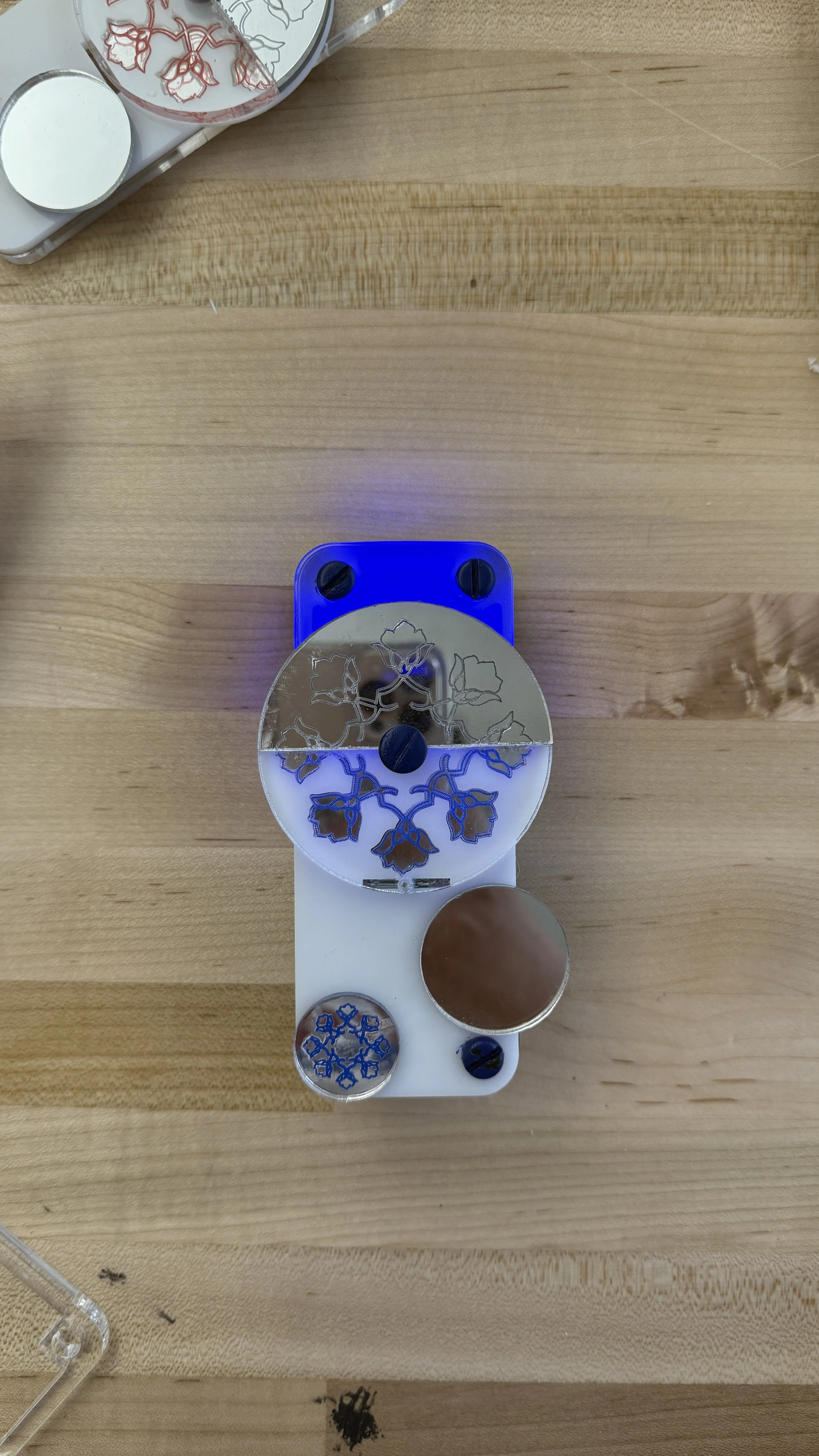 Materials used: Laser-cut acrylic, cobalt blue spray paint, LED, batteries, custom electrical circuit, reed switch, magnets, and screws.