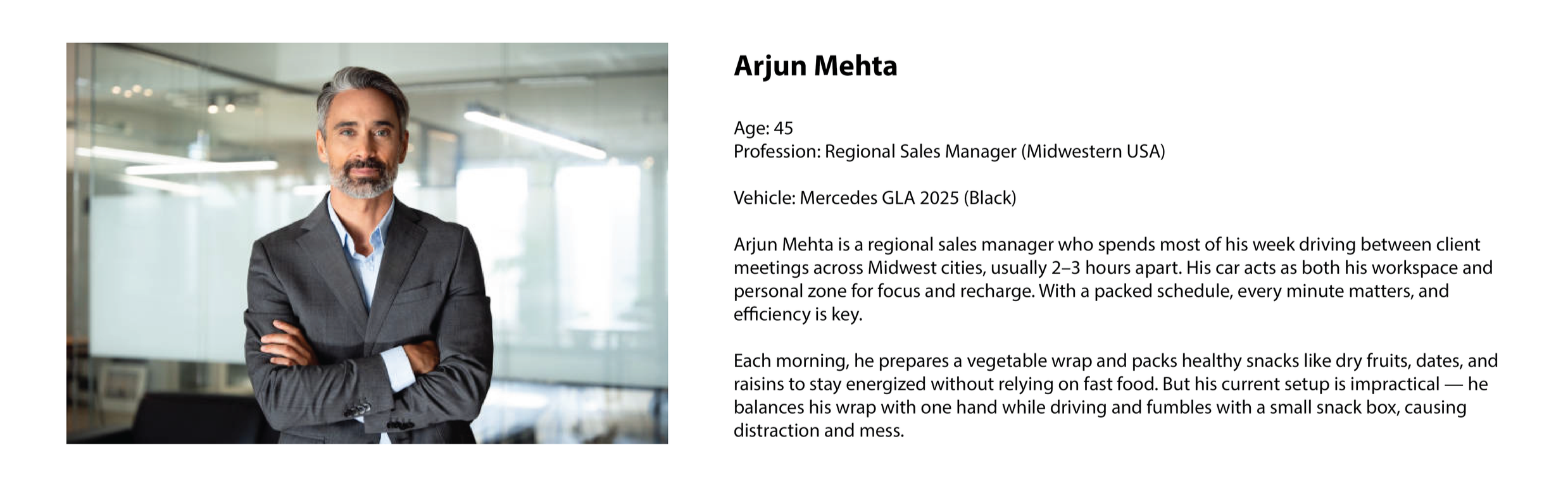 The On-the-Go Meal Experience is a meal box system designed for professionals with fast-paced routines who want to enjoy a wrap and quick snacks during their commute. Developed as a concept for the 2025 Mercedes GLA, the design integrates convenience, organization, and premium detailing to complement the vehicle’s lifestyle and interior language.