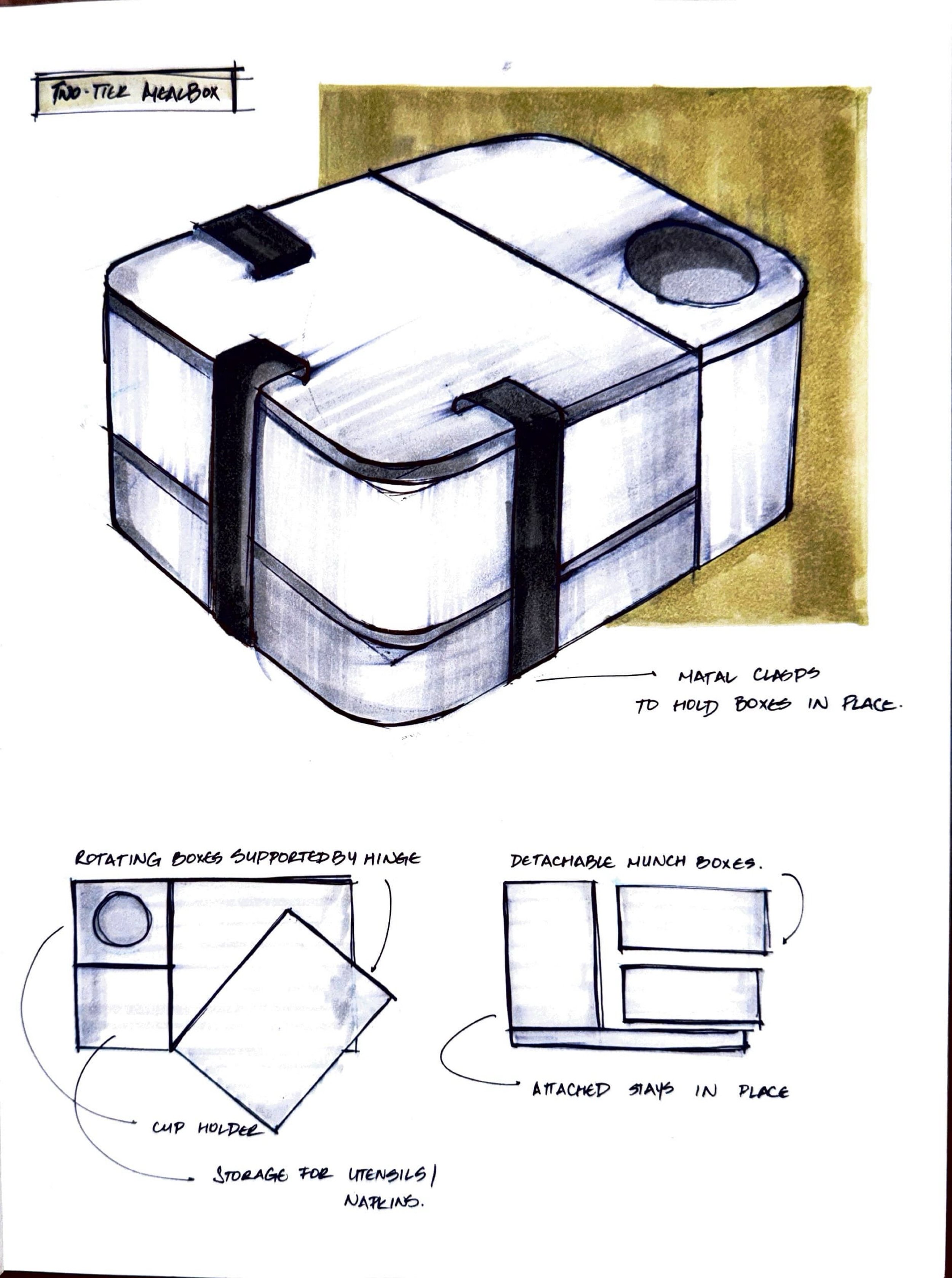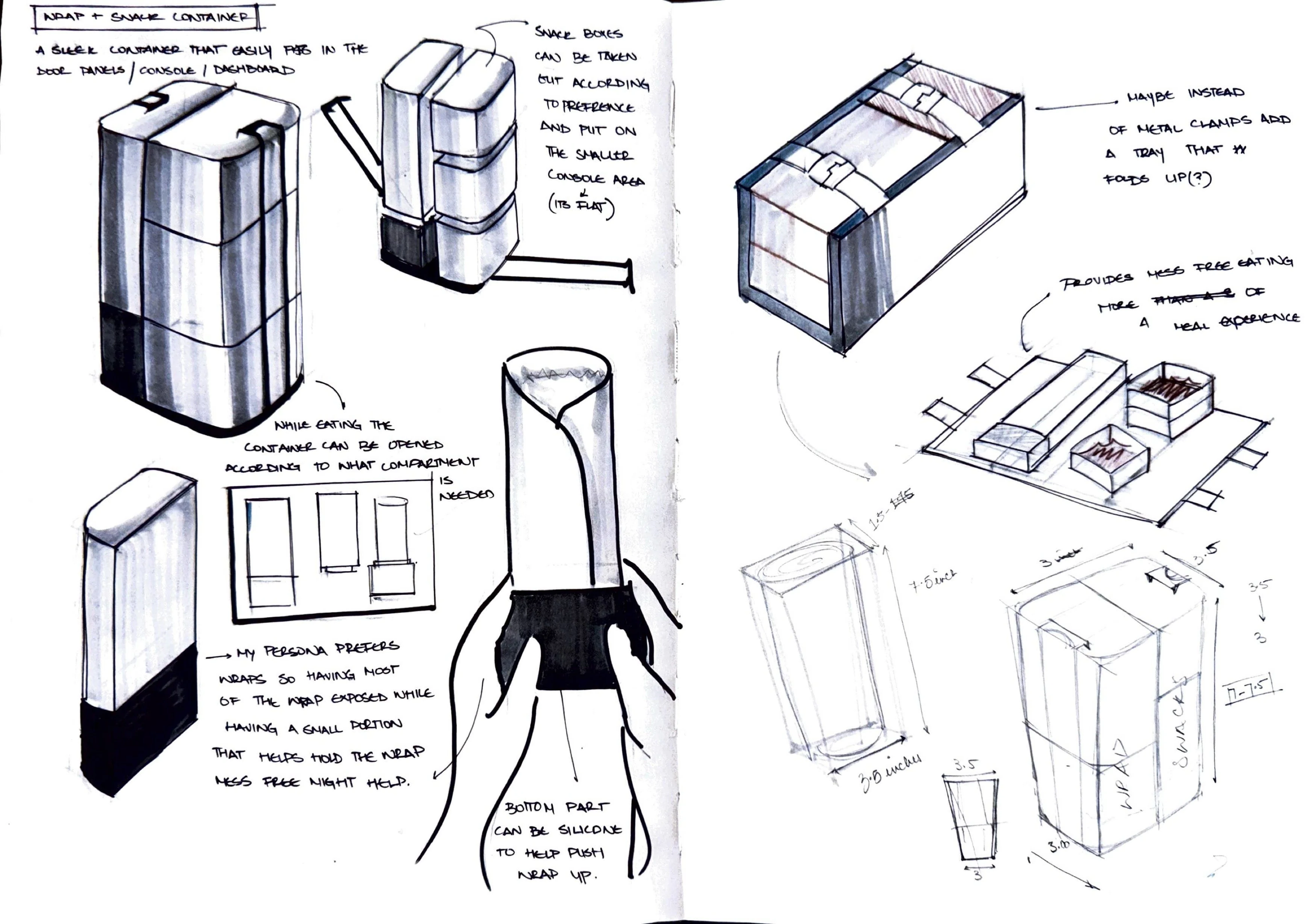 The meal experience was designed specifically for eating a wrap on the go with minimal spillage. I wanted the snack container and the main meal compartment to feel cohesive, yet distinct. To achieve this, they open in different directions, informed by ergonomics and the ease of grabbing a snack or meal while driving.